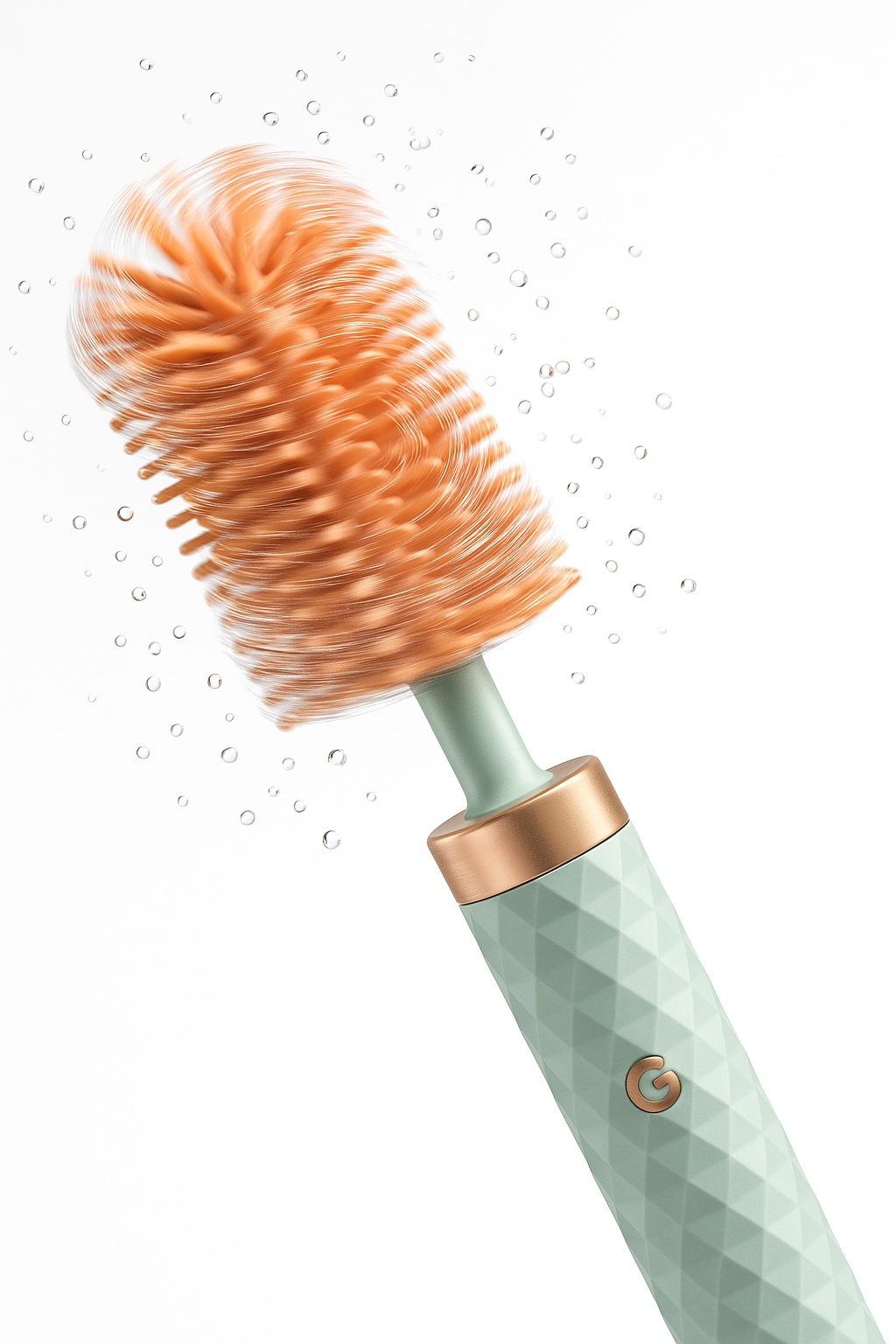 The silicone brush head is easy to disassemble and rinse, the brush body can be cleaned with a damp cloth and detergent, and the brush head can be washed in a dishwasher.